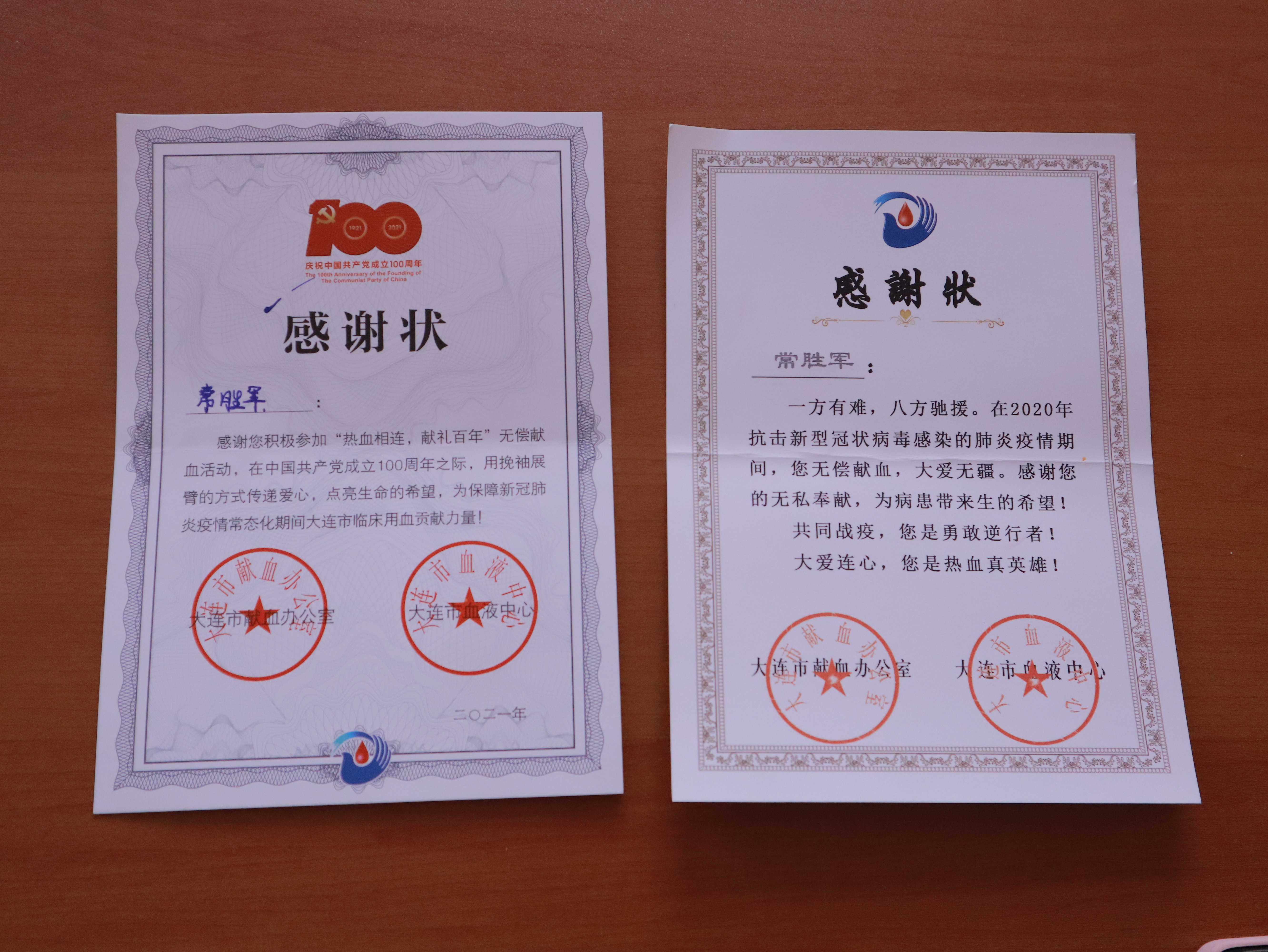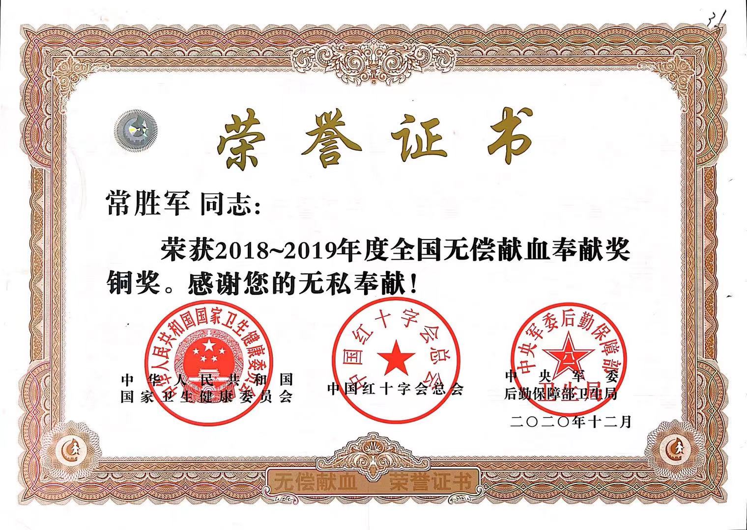 榜样的力量是无穷的,在2020年1月逆行到武汉的医护人员感动了中华大地之时。常胜军同志为之鼓舞,也想为疫情奉献自己的力量。他了解到血库紧张的情况后,第一时间去献了血,获得了“最美逆行者”的证书。