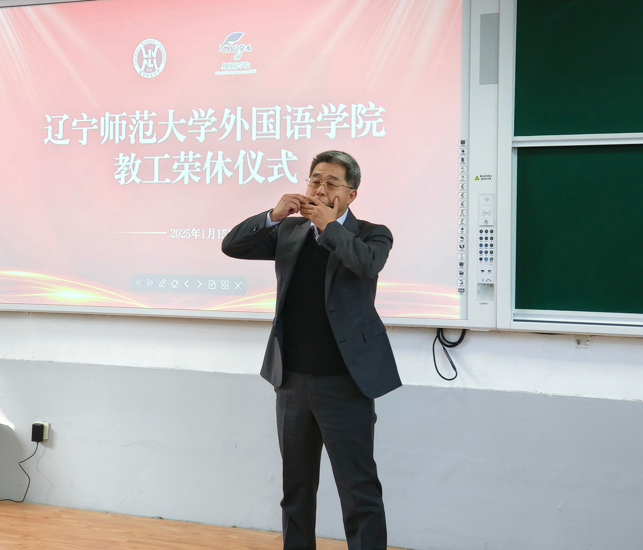 荣休教工代表许凤才老师的口琴独奏更是将气氛推向高潮。许老师吹奏的《外婆的澎湖湾》旋律悠扬,那灵动的音符从口琴中跳跃而出,既展现了荣休教师们多才多艺的一面,又似在诉说着对学院师生的不舍与祝福。