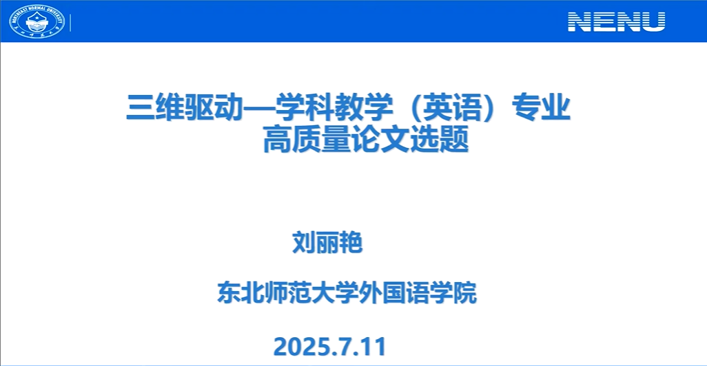 2025 年 7 月 11 日晚七点,乐鱼leyu(中国) “致远讲坛” 第四期学术活动在线上顺利举办。本次讲座特邀东北师范大学乐鱼网页版博士生导师刘丽艳教授主讲,题为《四维驱动 —— 学科教学(英语)专业高质量论文选题》,旨在为学科教学(英语)专业的研究生及导师提供论文选题的思路与方法指导,助力提升选题质量。活动吸引了本专业近百名硕士研究生及部分硕士生导师参与,讲座由姜晖院长主持。